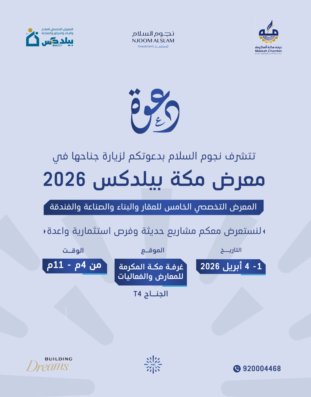 يسرّنا دعوتكم لزيارة جناح نجــوم السـلام ضمن فعاليات معرض مكة بيلدكس 2026 حيث نلتقي بكم لنستعرض رؤيتنا في تطوير المشاريع العقارية، والاطلاع على مجموعة من الفرص السكنية والاستثمارية الواعدة